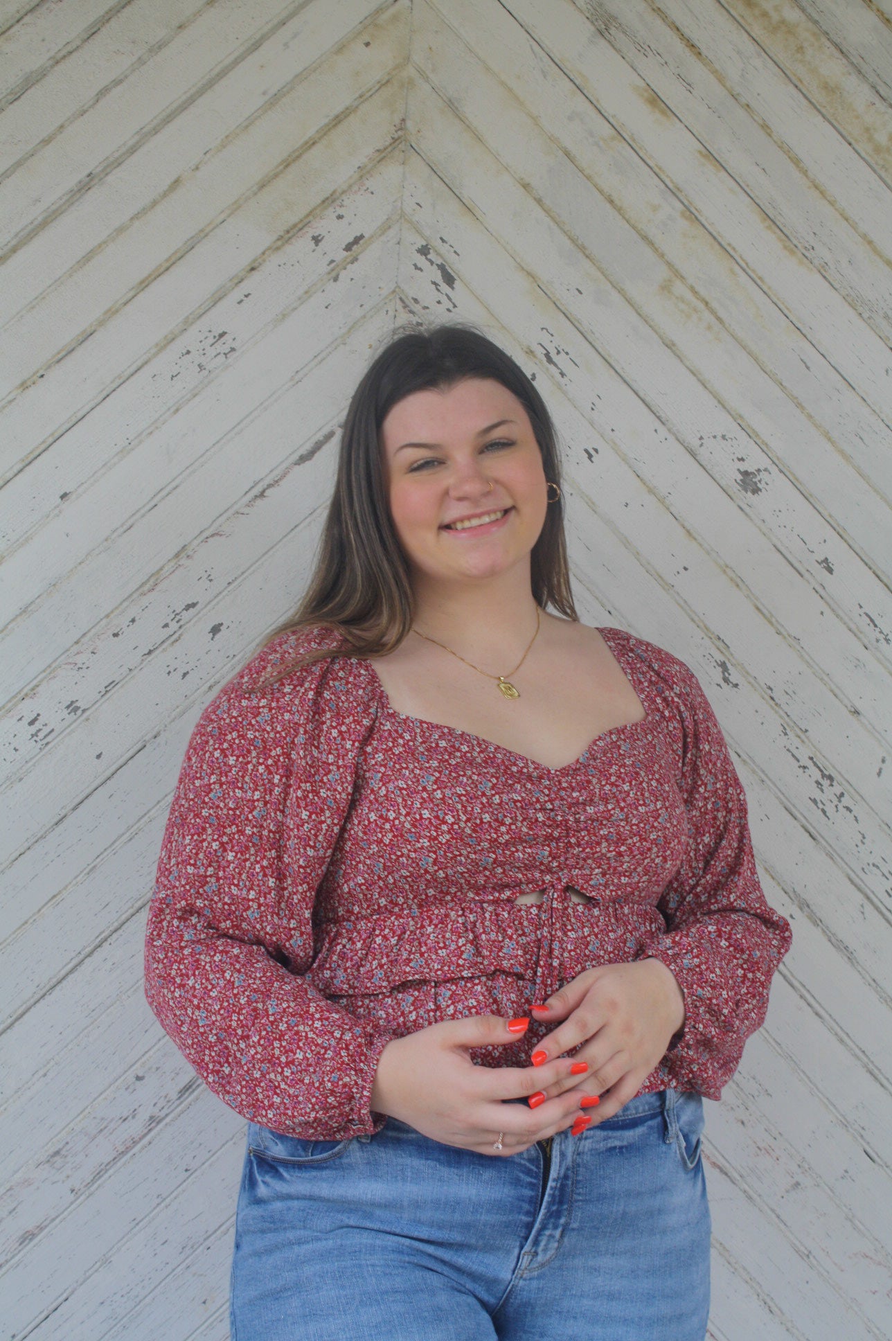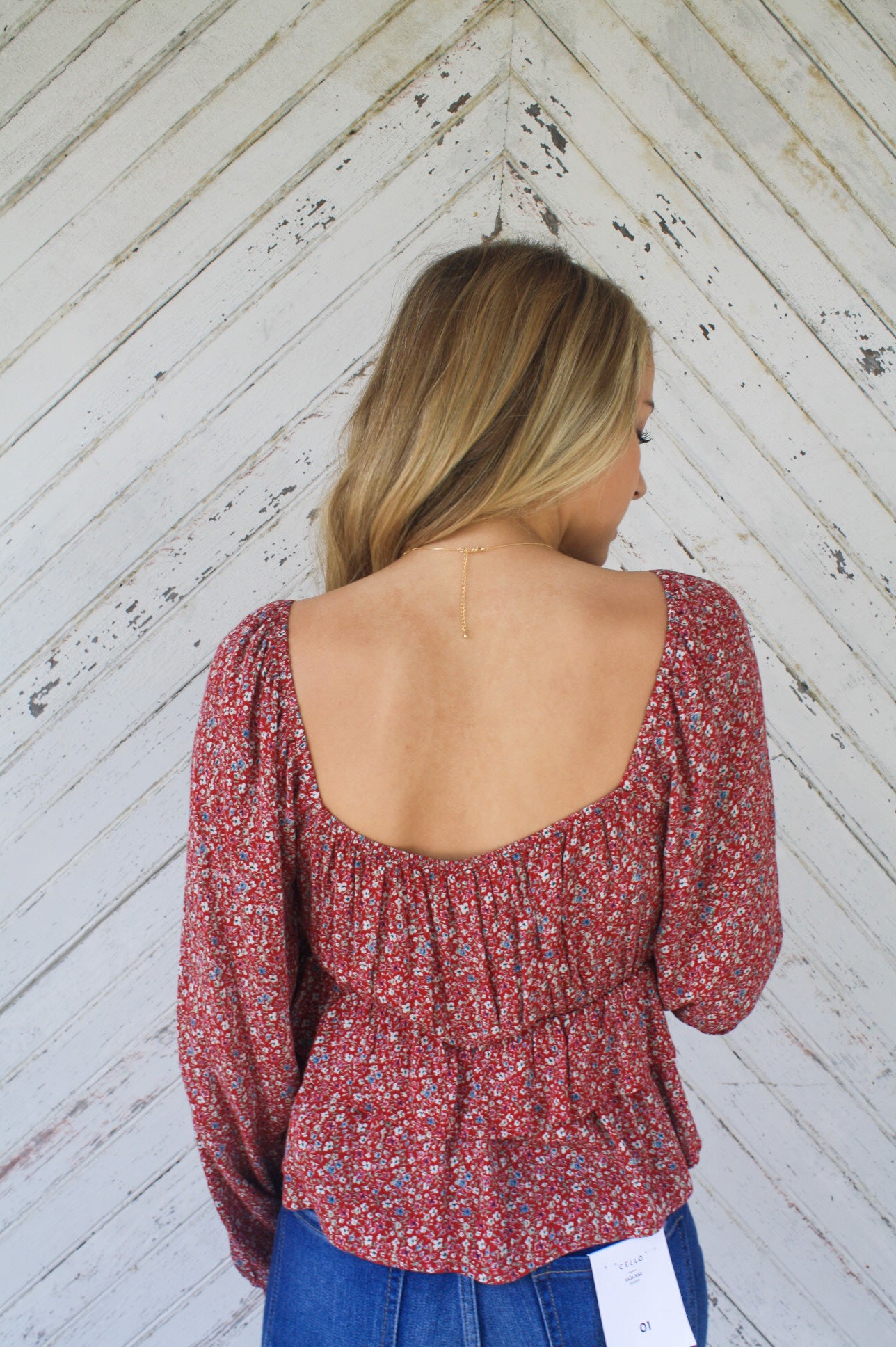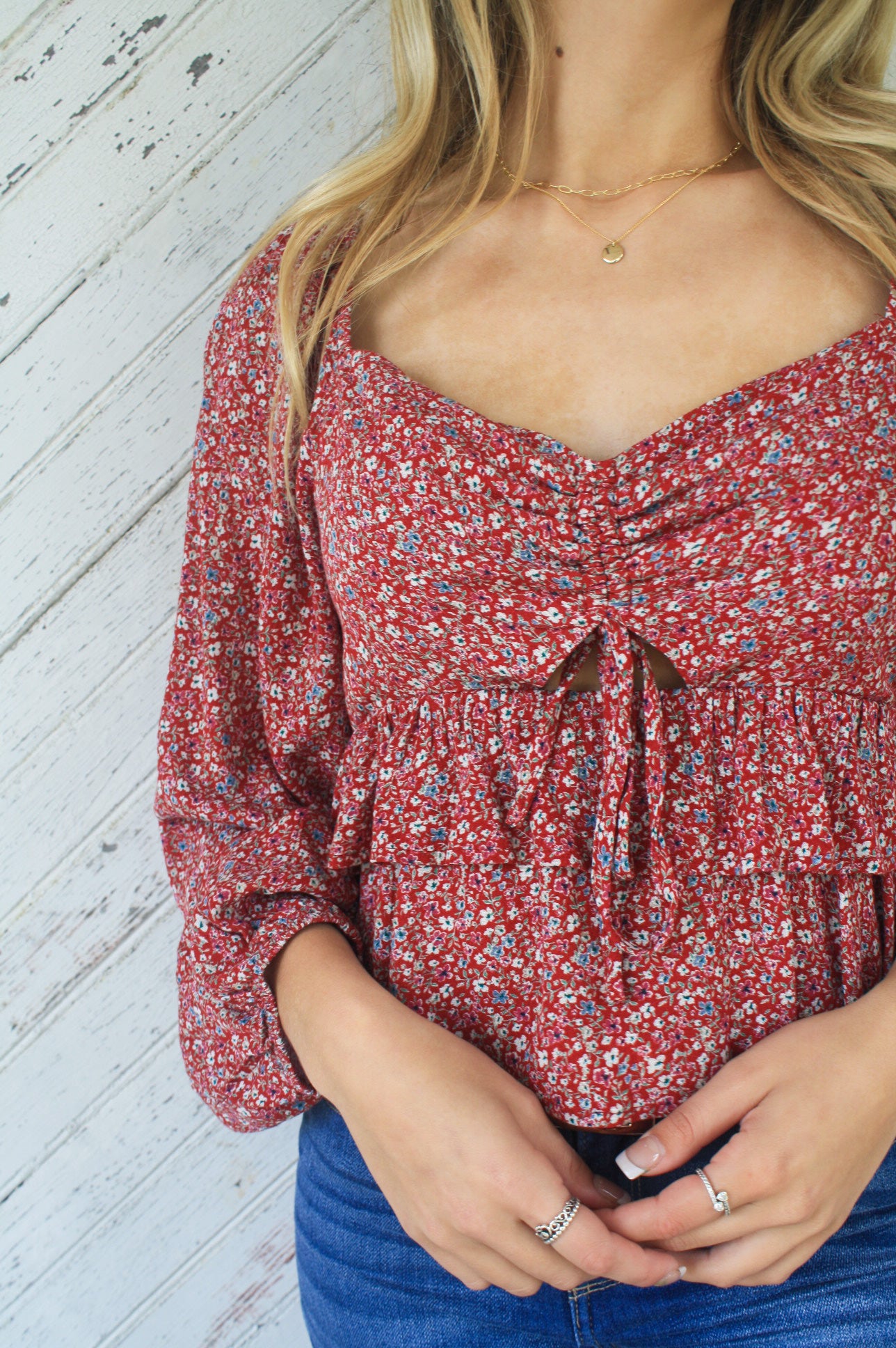 Our Fallin' Floral Top is the perfect dainty floral top your closet has been dying for! From the popping burgundy color with dainty flowers to the cutout in the front complementing the ballon sleeves, this top makes for the perfect fall outfit.