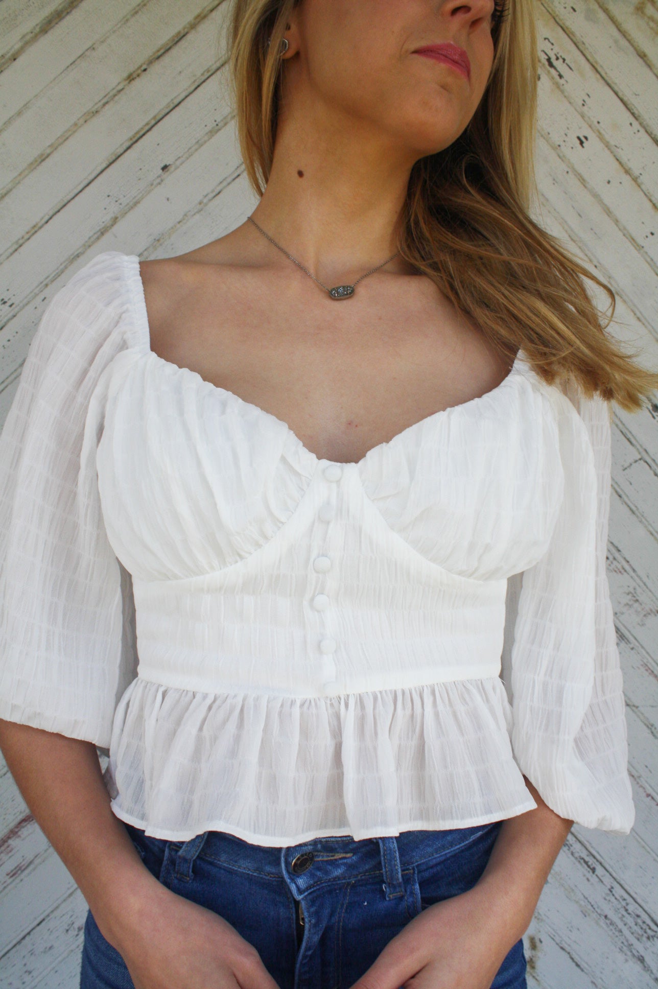 Our Springin' It Top is the classiest transition into Spring. Featuring a 3/4 sleeve, sweetheart neckline, and a button up ruffle blouse.