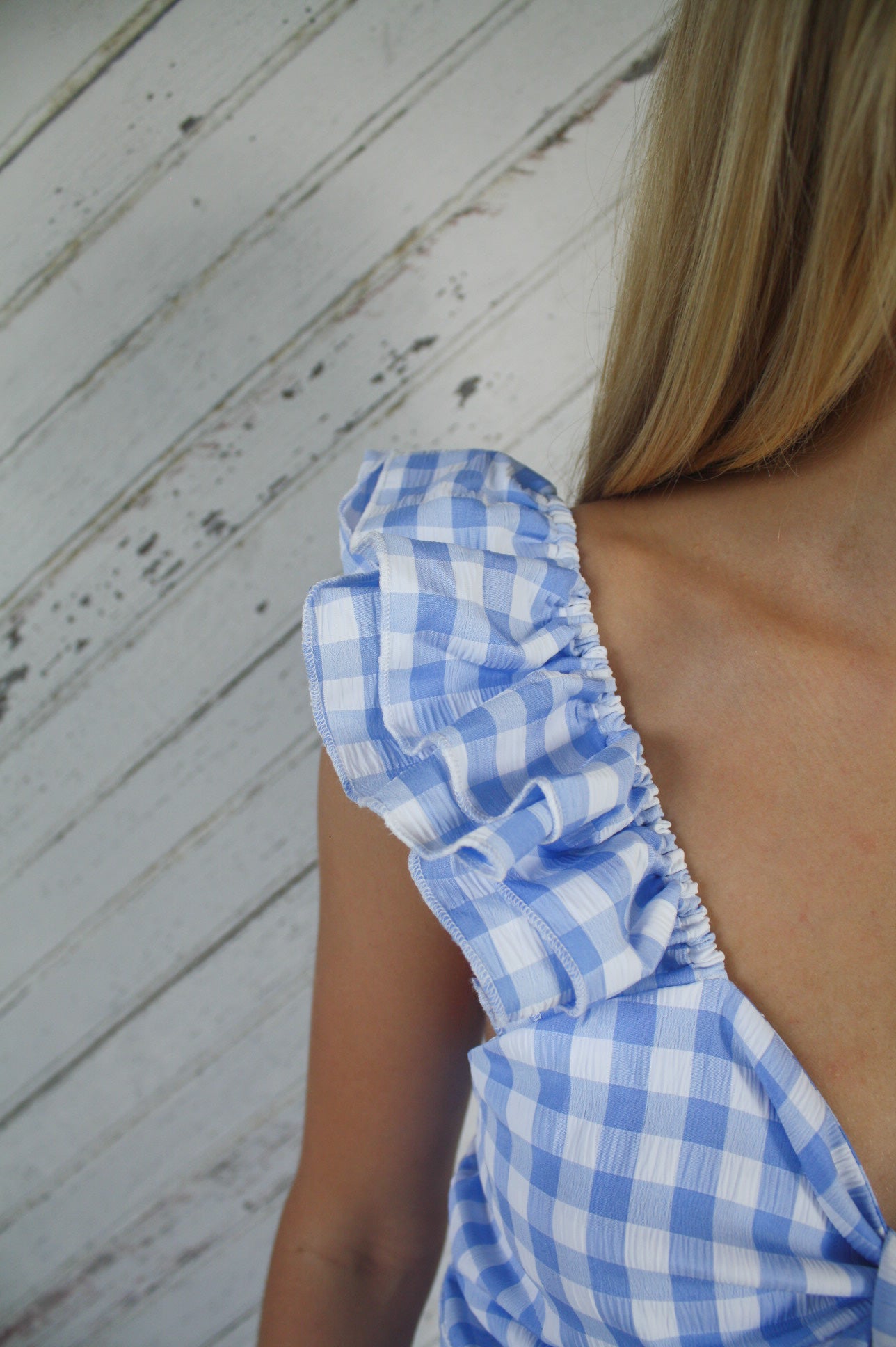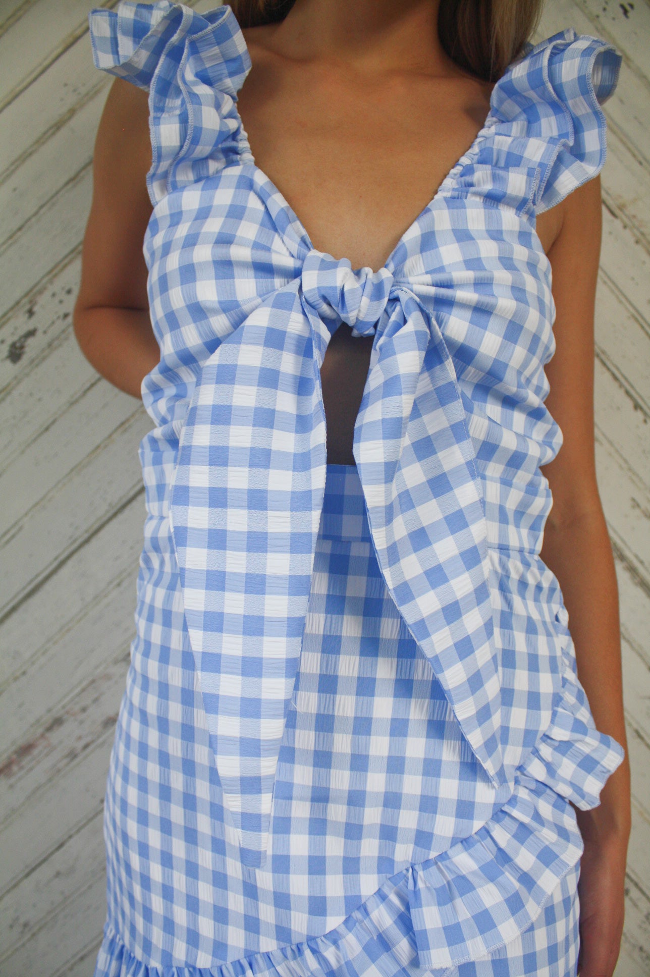 Our Wrap Me in Gingham Dress in an adorable baby blue is the edgy, but classy look we are going for this spring/summer! Featuring a front tie, ruffle bottom and shoulder, with an invisible zipper.